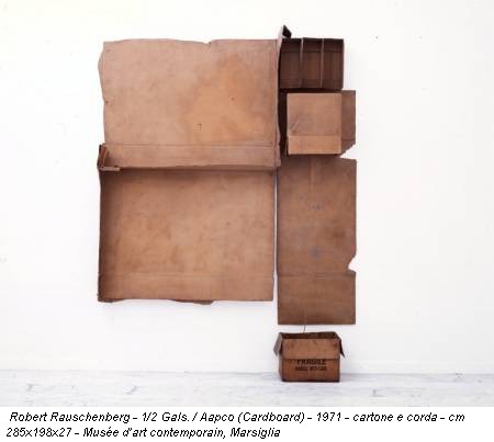 Non un percorso cronologico, dunque, ma un allestimento che privilegia l’accostamento di opere di serie contigue, che spesso condividono i materiali ma non le forme. Si comincia così con i Cardboard, scatole di cartone aperte e giustapposte, che rispondono alla dichiarata esigenza dell’artista di “lavorare con un materiale di scarto dalla consistenza leggera”. Come per il celebre Letto del 1955, l’oggetto d’uso comune viene sistemato a parete, ruotato dal piano orizzontale a quello verticale, silenziosa provocazione verso ciò ch’era stata l’Action Painting (o, almeno, più silenziosa dell’ancor più celebre “cancellazione” di De Kooning). Ciononostante, Leo Steinberg non esiterà a individuare in lavori di questo genere un nuovo paradigma, definito flatbed: un’orizzontalità intesa come piano da lavoro, una sovrapposizione di elementi raccolti dal quotidiano per annullare “l’intervallo tra arte e vita”.