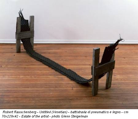 Ancora in riferimento ai primi anni ’50 può essere letta un’opera come la striscia di battistrada in mostra (Untitled Venetian, 1973): non più l’impronta dello pneumatico (Automobile tire print, 1953) ma l’oggetto vero e proprio, sistemato a suggerire una gondola veneziana.