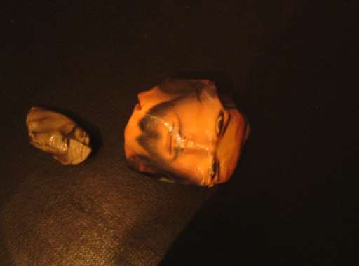 Personaggi noti e meno noti della storia dell’umanità ridotti in pietre – sguardi immobili ma espressivi – macchie di colore sul nero asfalto .