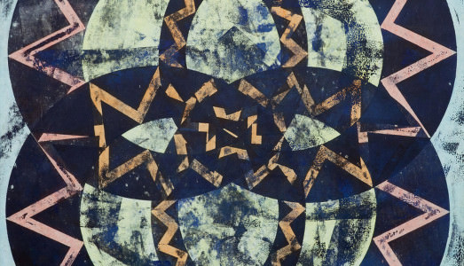 Di Philip Taaffe (Elizabeth, New Jersey, 1955) sono esposte opere legate al suo linguaggio più immediatamente riconoscibile, costituito cioè da elementi biomorfi, vegetali, simboli orientali, fusi o inglobati all’interno di una serrata geometria. Il risultato finale è la formazione di una struttura ad arabesco ben organizzata e calibrata, in cui si perdono i singoli elementi che la compongono. L’artista plasma forme sinuose dai colori vivi, sgargianti e seducenti, con sovrapposizioni di tonalità particolarmente raffinate ed eleganti, a tratti cangianti.