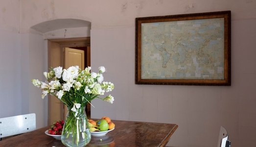 Una valigia di vetro e metallo protegge un cumulo di peperoncino. Ancora uno scrigno custodisce una forma di sapone. Questo è collocato su una mensola rialzata e per raggiungerlo è necessario un supporto: la scatola da imballaggio utilizzata da Satoshi per il trasporto di alcune delle opera in mostra, cioè quella che è stata la “Casa”, dove le sue opere hanno viaggiato. L’altezza non cela l’effluvio vetusto di quel sapone, essenziale oggetto che evoca un intimo contatto con il nostro corpo, ma anche un piacevole rilassamento che è sempre più una chimera.