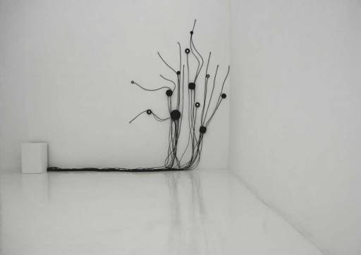 Ivy Noise, l’edera rumorosa che cresce grazie a un complicato quanto schematico andamento di speaker e diffusori sorretti da cavi elettrici, è frutto del concept della coppia artistica, ma ripartito secondo le diverse competenze. Se a Ddm – diplomata in arti visive e discipline dello spettacolo in Accademia – spetta l’ideazione dell’aspetto visivo, cioè la realizzazione dell’elegante ricamo nero dislocato su due pareti, è invece compito di Roberto Pugliese – diplomato in musica elettronica al Conservatorio – gestire l’apparato tecnologico.