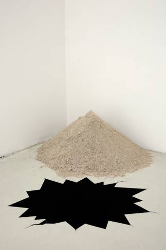 A emergere è un’atmosfera intima, domestica, in cui l’individuo – catturato nella più banale quotidianità – fa i conti con se stesso, col peso della propria psicologia. Una prova di forza che si materializza nel divertente mix formale di God must be crazy, comic strip che sfocia nella scultura. Una piccola sagoma trasporta faticosamente sulla schiena e getta in un dirupo enormi massi neri, che vanno ad ammonticchiarsi, realmente, a terra. Quello di Raparelli è un uomo che non soccombe alle difficoltà, forse perché trova riparo nella dimensione onirica, approdando in uno dei più tipici non-luoghi dell’immaginazione: l’isola che non c’è. Un minuscolo atollo di das su cui si erge un unico edificio, un po’ rifugio e un po’ prigione.