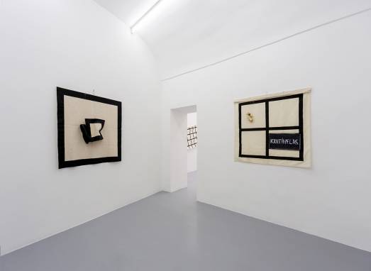 Per la mostra negli spazi di Umberto Di Marino, la prima personale in Italia, presenta una serie di opere realizzate, per la maggior parte, negli anni 2000 e tutte giocate su un serrato dialogo tra elementi che, rappresentati nella loro schietta superficialità, pure proiettano un’ombra enigmatica, seducente. Tele di diverse dimensioni giocano sulle pareti, si afflosciano su se stesse oppure tendono in obliquo verso l’alto, mentre le linee incrociate delle griglie, tracciate con rigore geometrico, si adattano alle pieghe e agli svolazzi. In questa serrata alternanza di pieno e vuoto, generata dai bianchi e dai neri compresi tra i moduli rettangolari della griglia, si giocano le ipotesi di rappresentazione della realtà, dello spazio individuale, sociale, politico. La storia è tutta lì, non c’è bisogno di altre strutture visive o esplicative per raccontarla, come in Made in USA, in cui la tela, ritagliata a guisa di bandiera, sembra garrire al vento, oppure in Kantinflas, riferita al noto attore messicano Fortino Mario Alfonso Moreno Reyes, in arte Cantinflas, nella quale compaiono anche altri elementi, una lavagnetta e alcune ossa, sempre inquadrati nel modulo geometrico.