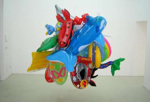Il Point of view, anzi per la precisione, i due point, panorami non esattamente da cartolina, sono ad acrilico bianco su stampa fotografica, e cambiano tra un incrocio e una svolta a destra, mostrando l’unica visuale possibile sugli elementi d’arredo stradale: mega cartelloni pubblicitari ai bordi delle strade, l’enfilade di cassonetti dell’immondizia, i copertoni ammassati dalla forma in simil-muro, che passano ormai quasi inosservati. Da tutti, ma non da Tibaldi, che recupera stavolta anche un altro elemento itinerante delle nostre spiagge, coloratissimo nei suoi numerosi salvagente, giochi per bambini portati a spalla da un uomo con un’identità divenuta ignota appena sbarcato sull’italica costa. Untitled per rimanere in tema.