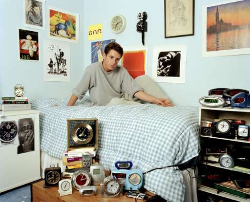 L’obiettivo ha freddato un campione di gente comune, mentre dà fondo ai suoi pallini quotidiani, inghiottiti come la proverbiale mela del dottore: le prestazioni da studio improvvisate dopo il bagno, quando lo specchio è un elisir di lunga vita, o una signorina oversize tutta coloranti che scala con gli occhi i piani di una torta gigante. Vista al cannocchiale la normalità a volte fa paura: farsi fotografare con nostalgica grandeur nel salone di casa propria, o rimanere con gli occhi sbarrati nell’attesa angosciosa che le sveglie puntate all’unisono suonino a dovere. È la dura sentenza contro l’incertezza di chi si pasce nel sogno di una vita diversa, e nell’intimità non trova che lo spazio per coltivare le sua molli aspirazioni. Ma non è anche violazione della privacy, dove chi vuole fa quello che gli pare e piace?