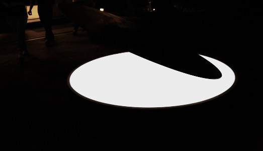 Da questa unione è stato realizzato un elegante intervento d’arte contemporanea che è perfettamente inserito al centro del chiostro/giardino dell’antico edificio del 1300. L’ingresso del Palazzo permette uno spontaneo incontro con il lavoro, le cui forme geometriche, perfettamente pure, dialogano naturalmente con l’imponenza dei profili della storica struttura. L’opera è composta da due grandi dischi leggeri sovrapposti, con un’angolazione di 23°, pari all’inclinazione dell’asse terrestre, concludendosi con una morbida “autoilluminazione” realizzata con pannelli solari e accumulatori che convogliano l’energia per diffonderla in maniera poco invasiva e circoscritta in funzione della sola installazione.