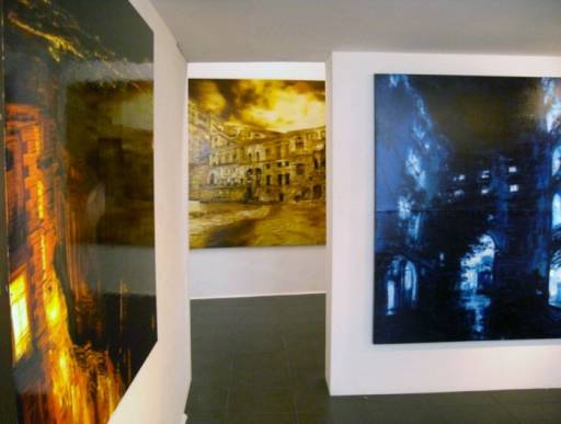Precisione e razionalità da architetto sono in qualche modo rinnegate; il risultato ottenuto è tutto uno sfasarsi di prospettive, con gli edifici in equilibrio precario che si mostrano da insolite angolazioni. Il procedimento dell’assemblaggio visivo diviene poi materico, testimoniato dalle evidenti cuciture che corrono ai bordi delle singole tele. Cicatrici, più che rammendi.