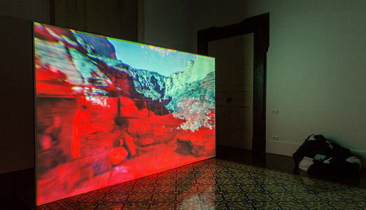Two owls on a mountain … and a snake at the bank ci mostra un’auto che attraversa il paesaggio roccioso, a guidarla è Ernst con accanto Dorothea Tanning, in viaggio dall’est all’ovest dell’America alla ricerca di un riparo. Il lavoro annuncia il fulcro dell’esposizione che è nella ambiente adiacente, un sipario è il limine che ci introduce a una dimensione in cui il tempo, lo spazio e la storia si sdoppiano coinvolgendo il visitatore in una esperienza ubiqua. Real estate astrology (Astrologia immobiliare) è, infatti, un film in 3D in cui, ancora una volta, Rossi mette in dialogo vicende e artisti. Il lavoro è stato editato da due professionisti che hanno prodotto due sequenze video differenti che si sovrappongono e si possono osservare una con l’occhio destro e l’altra con l’occhio sinistro, sempre col supporto delle apposite lenti. I due racconti visivi traducono un’antica pratica secondo cui è possibile scegliere una casa in base ai calcoli astrologici, usanza tipica di Sedona, la capitale del New Age. La costellazione di immagini disturbanti ha per sottofondo la voce di un astrologo che descrive il quadro astrologico di Ernst, quasi a voler evidenziare l’aspetto fatalista dell’arrivo dell’artista in Arizona e il legame esclusivo con il rifugio Hopi che lo ospitò per lungo tempo.