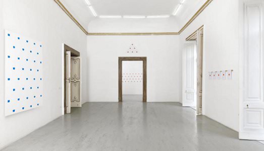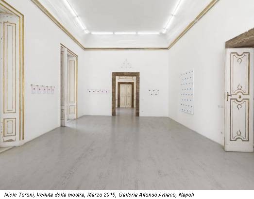 Quindi, anche relativamente alla quinta personale dell’artista, presso la galleria Alfonso Artiaco, andrà ribadito quanto fatto per le quattro precedenti e in generale per tutte le altre. Nemmeno l’intervento celebrativo del suo settantottesimo compleanno, ‹‹78 impronte di pennello n°50 a intervalli di 30 cm per festeggiare i miei 78 anni senza intervalli››, ha reso, infatti, la sua opera propriamente site specific. ‹‹Da più di 40 anni Niele Toroni lavora con uno schema fisso: impronte realizzate con un pennello n°50 a intervalli di 30 cm. Ogni lavoro, che l’artista preferisce chiamare ‘Travail/Peinture’, è eseguito con questa procedura su disparate superfici: tele, carta, muri, soffitti, pavimenti… La regolarità del suo ‘metodo’ è data dalla continuità spaziale della distanza dei 30 centimetri e dal ritardo temporale del gesto dell’artista definendo così un ritmo formale.