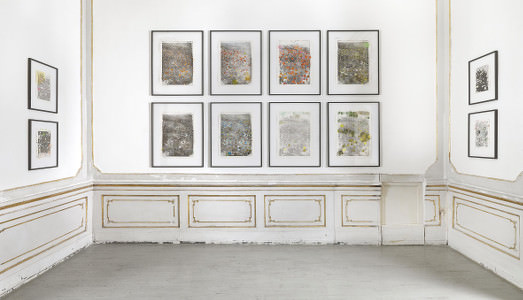 Allora, trasversale alla sagoma del vulcano, alla sinuosità del golfo e ai ritmi della città, si staglia l’ideale parcellizzato dell’oggetto ritratto, l’immagine che sfugge ed è posseduta, riadattata e distorta dalla comunità globale. Tale interferenza è espressa tramite pesanti grumi di colore, macchie che nascondono la rappresentazione e creano un terzo livello di lettura, dopo quelli della tela e della figura. Questa sovrapposizione è usata come metodologia anche in Barboncino bianco, barboncino nero, dove la copertina patinata di una rivista di moda diventa schermo appiattito del vero, un fondale evanescente dal quale emergono profili astratti di colore. La divergenza tra la stabilità della forma e l’accidentale dell’astrazione, tra la cosa e l’immagine, è evidente nella serie di paesaggi floreali su fogli di carta, che occupano interamente una sala della galleria. I tratti stereotipati delle vedute naturalistiche si dissolvono tra i toni di grigio, che tentano di restituire una base visiva definita, e le increspature del colore rappreso in concentrazioni indeterminate.