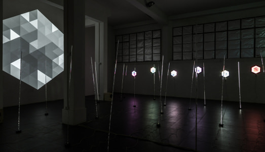 Aisu concepisce la videoarte come un complesso meccanico in grado di produrre autonomamente quell’arte a cui ha preventivamente impresso un marchio, una natura, una sorta di provenienza. Il flusso di immagini riprodotte, gli esagoni che si compongono sulla parete bianchissima a riempirne il vuoto, si disfano per ricrearsi in altre forme, secondo un ordine premeditato che suggerisce, tuttavia, un’idea di casualità.