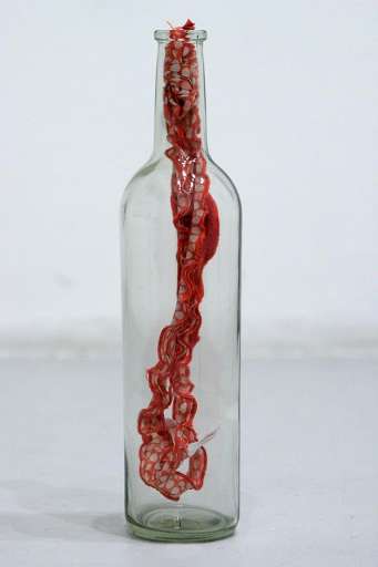 Ciò che interessa all’artista è creare piccoli nuclei di energia, un dinamismo scultoreo che è già insito nella scelta dei materiali, oggetti vissuti, carichi di una storia personale che va preservata. Di certo avvolgere un mucchio di scarpe femminili nella pellicola potrebbe far pensare a una pratica fetish; eppure, a guardar bene, quelle calzature sotto vuoto raccolgono e raccontano una vicenda sottratta all’oblio. E lo stesso può dirsi dello slip imbottigliato, un intimo messaggio tutelato dall’involucro, ma lanciato in un viaggio senza mete predefinite.