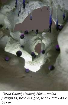 Protagonista della prima tappa è la sede glamour (per via del quartiere dove è collocata) della galleria, in cui si sviluppa un percorso continuativo tra il varco spaziale (essenziale in tutti i particolari) ossia Espax, un’installazione ancorata al soffitto della saletta e ideata in rapporto a questo ambiente, bianco e stereometrico, e le opere su carta. Un fascio di luce bianca e forte viene gettata dai neon attraverso una fenditura cilindrica aperta nel soffitto ed incorniciata da un telaio a raggi in stucco. L’ambiente risulta così manipolato ed Espax diventa “una via d’accesso –spiega Casini- tra lo spazio inteso come universo e lo spazio reale in cui ci troviamo”. Sono le grandi metamorfosi insite nel divenire stesso della natura a cogliere la sua attenzione, dando origine alle sculture in ceramica collocate sui minerali, in cui gli oggetti -che avevano a loro volta subito una mutazione- venivano elaborati artigianalmente inserendoli nel cristallo di quarzo. “Il mio intento –continua l’artista, aretino sedotto dalla Svizzera- era di rendere i miei disegni in 3d, portare nel concreto la loro tridimensionalità”. La geometria dei minerali e il mondo lunare hanno attivat