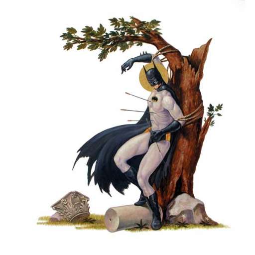 Mentre nel resto di Modena la gente cercava risposte a grandi questioni filosofiche, nel centro storico della città i fiabeschi personaggi di Vanni Cuoghi (Genova, 1966) interagivano con gli spettatori alla Galleria San Salvatore. Nell’opera di Cuoghi si alternano personaggi provenienti da immaginari diversissimi tra loro, associati da una figurazione omogenea e da una evidente cifra stilistica permanente. L’artista riprende un’iconografia rinascimentale, illuminista e allo stesso tempo ricade in un universo dal sapore popolare. La mostra affonda le radici nella nostalgia verso il passato, nelle sue innumerevoli forme, dall’infanzia al mondo degli avi, fino all’Eden dal quale l’uomo è stato cacciato per le sue intrinseche caratteristiche. Un uomo peccatore ma ironico. Un uomo vittima dei propri miti ed eroi, come Cuoghi svela attraverso la morte di Batman, sacrificato come San Sebastiano.