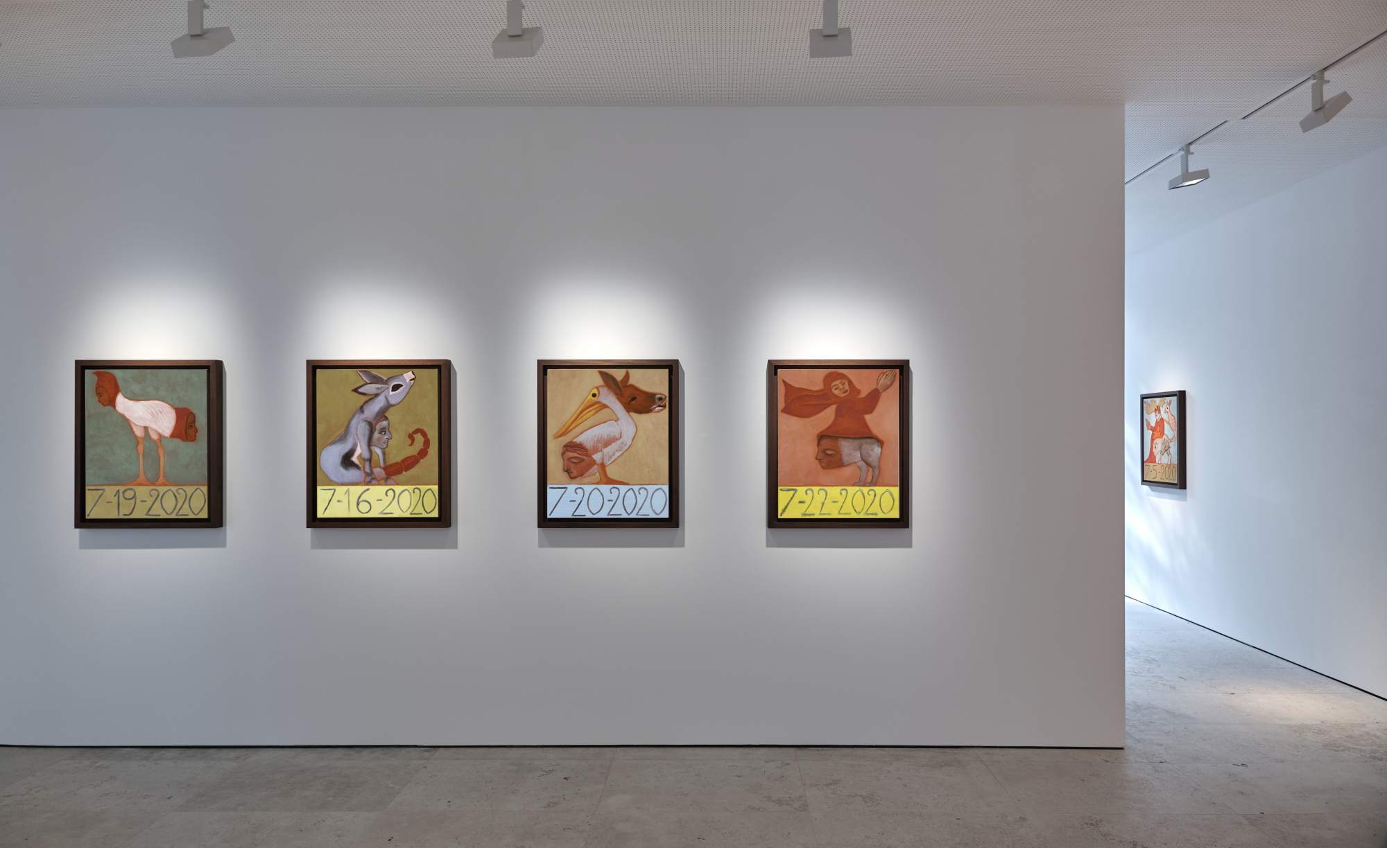 Bestiary 2020, esposto alla galleria Maruani Mercier (fino al 17 ottobre), «è un gruppo di quattordici dipinti che Francesco Clemente ha creato quest’anno durante la chiusura, in giorni pieni di incertezza, confusione e ansia, giorni registrati in caratteri di spicco su ogni dipinto.