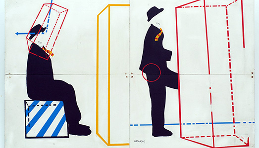 Questo è proprio l’anno di Aldo Spoldi (Crema, 1950), protagonista fino al prossimo 10 novembre a Milano, nelle sale della Fondazione Marconi, di un imprevedibile progetto espositivo, a cura di Patrizia Gillo, personaggio virtuale nato dalla fantasia dell’artista. Si tratta di una mostra commissionata dall’Accademia dello Scivolo, associazione fondata da Spoldi nel 2007 e “volta alla ricerca del bello sensibile”. Ma partiamo dall’inizio: lo spunto per la realizzazione di questo progetto viene da una lettera che Aldo Spoldi indirizza a Giorgio Marconi e nella quale dice che, guardando indietro nel suo passato, gli è scattata la molla di fare un quadro nuovo che chiamerà “Antologica”, poiché in esso convivono passato e presente e da esso derivano altri quadri, altre storie, altre mostre. Di fatto questo nuovo lavoro corrisponde al racconto surreale e mirabolante dell’intera vicenda artistica di Aldo Spoldi dal 1968 ai giorni nostri: una sorta di gigantesco teatrino in cui l’artista-burattinaio muove i fili dall’alto, facendo oscillare le figurine, alla ricerca di molteplici combinazioni. E, oggi, si aggiunge, sempre a Milano, questa volta da Antonio Battaglia, un nuovo capitolo a questo caleidoscopico abecedario dell’opera di Spoldi. Si tratta di un approfondimento del periodo 1968-69, con lavori su tavola, che vanno a comporre immagini iconiche, ironiche e concettuali in continuo movimento. Opere queste mai esposte, che l’artista ha sempre conservato nel suo studio e negli armadi di casa sua. Tempere, collage e matite scrivono la storia di quegli anni; la storia di un giovane artista che delinea il proprio linguaggio personale, quello della Banda del Marameo, capitanata dallo stesso Spoldi con i suoi compagni di accademia in giro per il centro di Milano e di Crema a fare marameo ai passanti e alle autorità. Tutto è documentato dalle fotografie di Met Levi, da una multa dei vigili di Crema e da svariati articoli dell’epoca. Una risposta ironica alla contestazione giovanile del ’68, alla Pop Art e agli happening di quegli anni.