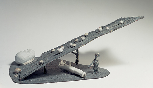 Ciononostante Alik Cavaliere ha continuato a scolpire con rigore e coerenza, a fare ricerca lontano dai facili isterismi e dalle provocazioni, spesso completamente sterili, di un certo versante (a lungo dominante) dell’arte contemporanea. Con un approccio etico, prima che estetico. È quanto emerge con evidenza lungo il percorso espositivo che si snoda a Palazzo Reale, dalle sue monumentali Metamorfosi dei tardi anni Cinquanta all’innovativo personaggio “Gustavo B.” dei primi anni Sessanta, protagonista di un racconto composito sulle tante esperienze dell’uomo del tempo, accostato a Bimecus, una valigetta “fai da te” contenente elementi in bronzo e legno, un tempo componibili anche dall’osservatore per entrare in sintonia con l’autore. Oppure in capolavori come Quae moveant animum res. Omaggio a Magritte (1963) o nel famoso Monumento alla mela (1963).