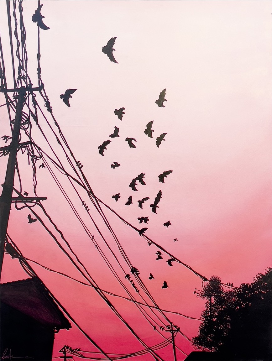 Luca Azzurro con una pittura estremamente dinamica e dominata dalla forza dirompente del colore si ispira principalmente alla Pop art, alla graffiti art e alla street art. Approccia la sua arte nell’intento di trasferire sulla tela tutto un repertorio di immagini strettamente connesse con l’attualità e con il mondo che circonda il riguardante: corvi su alberi spogli o su tralicci; animali coloratissimi, quali zebre, pantere, giaguari e coccinelle; paesaggi urbani e rurali dai cieli inondati da luci violacee, lilla e blu; tramonti dai colori esplosivi, quasi fauve; volti di musicisti e di divi hollywoodiani del passato; pali dell’elettricità.