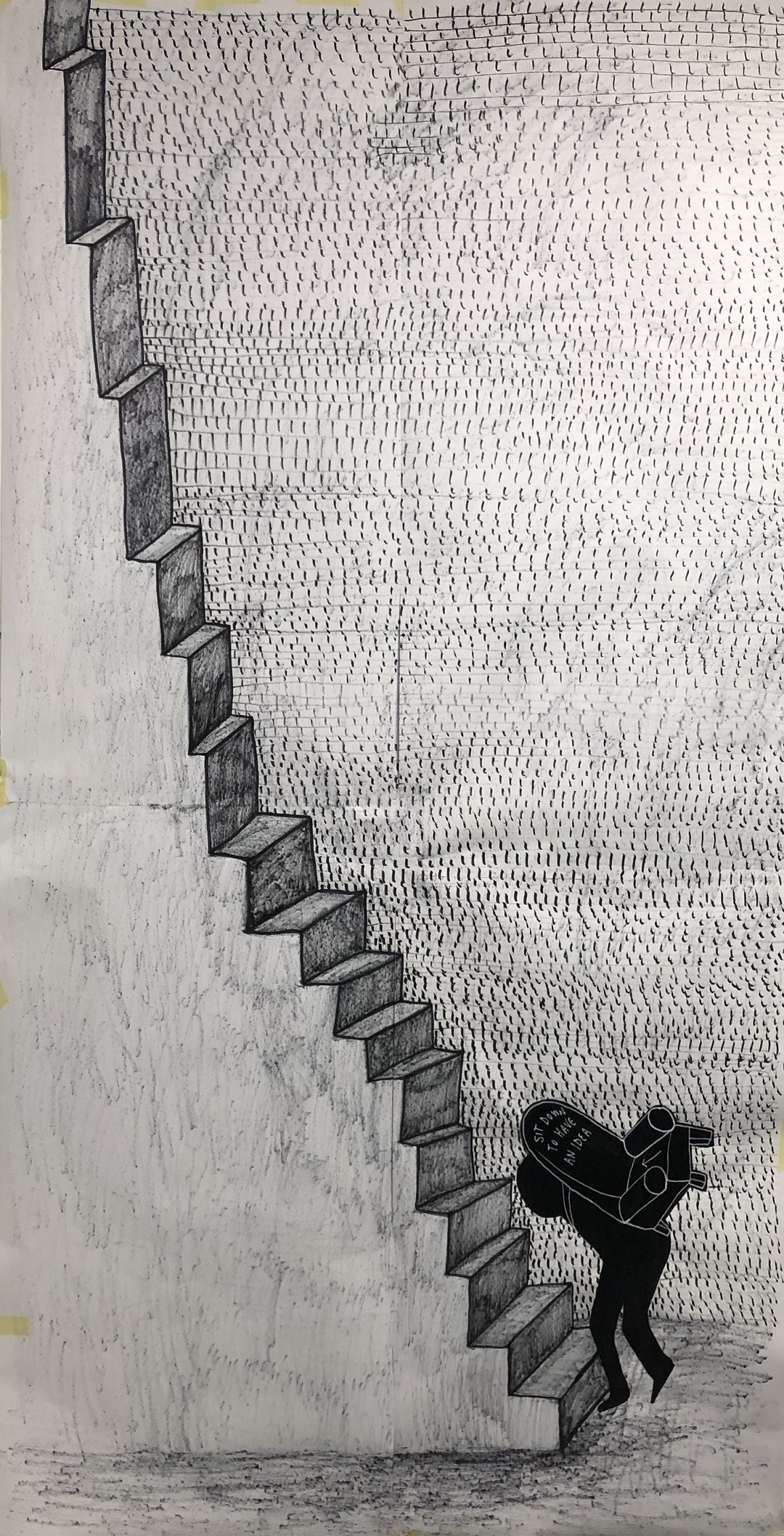 «La performance di Bianconi prenderà il via da un luogo potentemente simbolico di Vicenza, la Basilica Palladiana. Lì l’artista si carica la poltrona sulle spalle e inizia l’avvicinamento al Torrione: è da lì che la tromba di Ruvidotti funzionerà da riferimento e da richiamo. Il gesto di Bianconi è un gesto silenzioso che affida alla tromba la sottolineatura della tensione che lo pervade. La tromba enfatizza i vuoti che la performance prevede, nel momento in cui l’artista viene inghiottito dal Torrione e inizia la sua salita solitaria. Chi assiste non vede, ma condivide la tensione del momento grazie al suono senza pausa che invade la piazza».