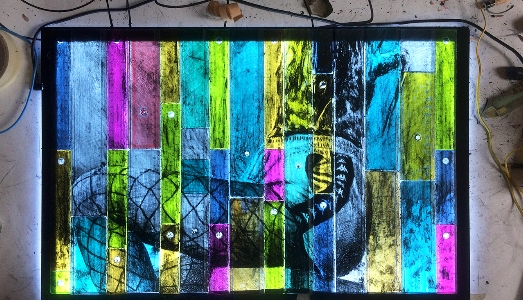 «La vicenda di Ambra ricalca esattamente quella biblica di Susanna e i Vecchioni, per questo ho immaginato di realizzare cinque grandi vetrate, come nelle chiese gotiche, che la raccontassero, sovrapponendola quindi ad altre storie e fonti, vere e di finzione: Dafne e Apollo, Pinocchio – personaggio simbolo del binomio bugia/verità – e le rivolte razziali dell’America degli anni Sessanta. Il tutto è stato disegnato su oltre 5000 righelli in plastica trasparente e colorata».