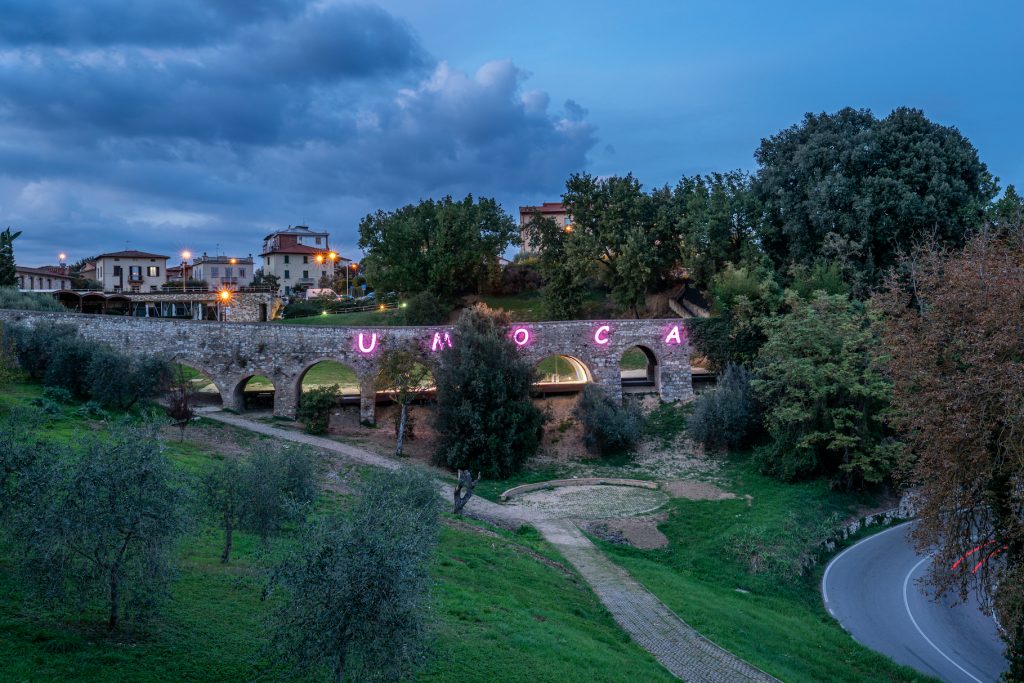«Lo stesso vale per Cecchini a Colle Val d’Elsa, negli archi del ponte di San Francesco, trasformato nel 2001 da Cai Guo-Qiang in UMoCA. All’”Under Museum of Contemporary Art” sono state esposte opere di artisti rilevanti come Mario e Marisa Merz, e, nell’estate appena trascorsa, alcune installazioni di Mimmo Paladino. Il 29 ottobre è il turno di tre grandi sculture di Loris Cecchini. Il ponte, come simbolo, sostiene la connessione e il rispetto delle differenti culture dell’umanità e Cai Guo-Qiang ha scelto proprio quello dedicato a San Francesco perché portatore di un messaggio di pace e rispetto tra le varie forme della natura e gli esseri umani, indipendentemente dalla provenienza culturale e geografica. UMoCA è nato dunque dalla volontà dell’artista Cai Guo-Qiang di connettersi profondamente al contesto naturale, storico e culturale di Colle di Val d’Elsa e con il simbolo universale della figura di Francesco d’Assisi, Santo per i cattolici ma universalmente simbolo di amore e rispetto per la vita, aldilà della provenienza. Tutti valori fortemente condivisi anche dalla nostra Associazione, per cui conta di più dove vogliamo andare insieme rispetto a da dove proveniamo come individui. Le sculture di Cecchini a UMOCA ben dialogano con questo contesto, creando una sinergia tra naturale e artificiale, grazie al proliferarsi di moduli metallici che esprimono contrasto tra materie minerali, come a rendere evidente la stratificazione che la città ha attraversato: da materiali semplici come mattoni, pietre e legno, al ferro e al cristallo che compongono il museo, all’acciaio delle sculture di Cecchini. Loris con le sue opere racconta l’oggi e apre al futuro, dando vita ad un’armonia con l’ambiente che vale la pena vedere coi propri occhi».
