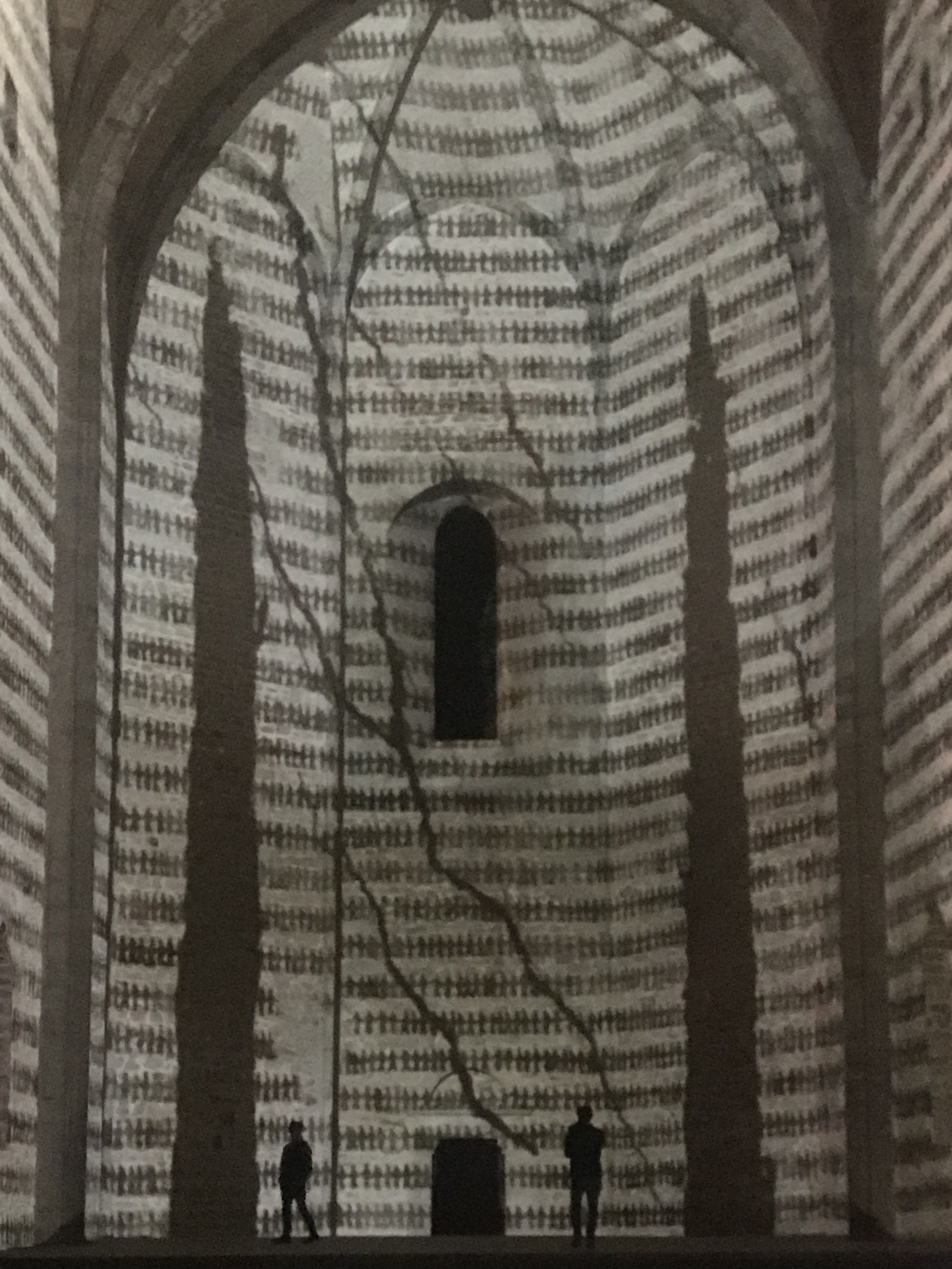 Nella Chiesa di Santa Maria dello Spasimo la perfetta installazione dell’israeliana Michal Rovner riflette sulla relazione tra luogo e identità: «Ho chiesto a quindici persone in Russia, in Romania e in Israele il permesso di filmarle tenendosi per mano, per creare una sorta di catena, di connessione umana», ci racconta. E nel buio dello Spasimo, dopo il tramonto, l’abside e il muro interno di quella che fu la facciata diventano un camminamento che ricorda migrazioni, la conta dei giorni dei carcerati, mixando contemporaneo e antico: «Adoro il medium effimero e attuale del video utilizzato sulle pietre della storia, si confondono i livelli», spiega Rovner.