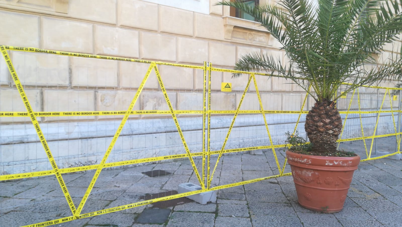 Non è un caso, in fondo, che Beatrice Merz ci racconti lo statement poetico e politico di BAM davanti a Palazzo delle Aquile, in piazza Pretoria (detta anche della Vergogna – ma per questa spiegazione vi rimandiamo ai libri di storia dell’arte), dove si incontra il nastro adesivo di Gupta che riporta (in italiano, inglese e arabo) la frase “Non c’è frontiera qui” messo proprio come una barriera alle transenne che circondano l’edificio, (per una situazione di caduta calcinacci). Un’installazione forte che, anche il Sindaco Leoluca Orlando, non ha avuto dubbi dovesse essere lì, ora.