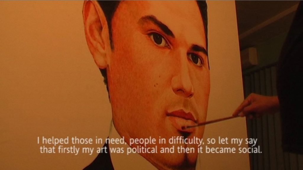 Alla Chiesa dei Santi Euno e Giuliano Driant Zeneli con la videoinstallazione When I grow up I want to be an Artist, racconta come il momento storico in cui ci si trova a vivere possa cambiare ruolo di una persona nel sistema, «La mia stanza era lo studio di mio padre, uno dei pittori ufficiali del partito comunista, e il suo mestiere era quello di ritrarre il dittatore Enver Hoxha e altri esponenti del partito; io sono cresciuto con il grande viso del leader addosso. Per questo ho chiesto a mio padre di ritrarmi nella stessa maniera del dittatore. Mentre dipinge, nel video, mio padre racconta di quando aveva voluto diventare artista, e di quando nel 1991 si è trovato all’improvviso a reinventare la propria vita in Albania, ultimo Paese nell’Est Europa in cui è crollato il regime comunista. Per sopravvivere iniziò a realizzare visti falsi per la gente che voleva scappare, falsificando le fotografie di diversi passaporti. Nel video lui pronuncia questa frase: “La mia arte da politica è diventata sociale”», ci racconta Zeneli. Un cortocircuito che si gioca in tutto il video, dove l’opera non rappresenta più il regime, ma il ritratto del figlio che lo ha portato a dipingere nuovamente.