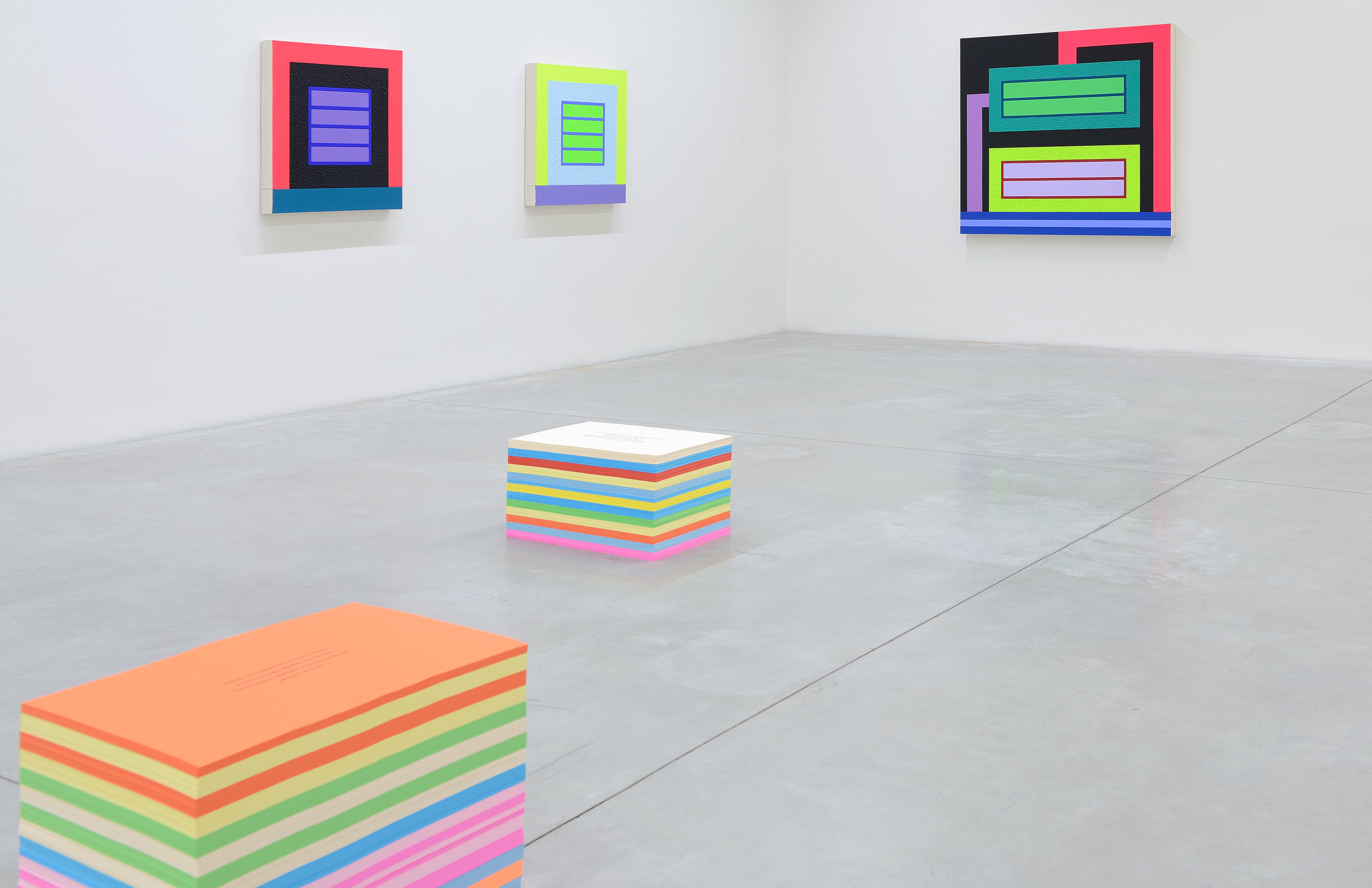 «Alcuni di loro hanno già fatto mostre da Astuni, lavorano o hanno lavorato con lui, come Carla Accardi, l’unica artista che non c’è più. Altri, come Peter Halley e Luca Rossi sono da Astuni per la prima volta: un super artista americano e un artista italiano discusso, che credo stia molto bene in una mostra come questa, perché nel suo lavoro riflette sulla questione di internet, sui social come youtube, che creano un paesaggio di cui è necessario capire le ricadute estetiche che ci sono o possono esserci nell’arte. Come si legano questi due artisti? Il lavoro di Peter Halley ripercorre i segni dell’astrazione che esistono nelle reti delle comunicazioni stradali, telefoniche, e così via, di fatto includendo un aspetto legato alla socialità nella contemporaneità. Lo stesso dicasi Garutti, soprattutto con l’opera in risma di fogli con testi, che invita i visitatori all’azione portare via un foglio. Oppure la intermedialità di Medalla, e di Cuoghi Corsello presenti con una scultura a quattro punte che fanno brillare la mostra come una stella».