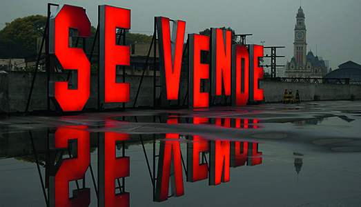 In alto: Carmela Gross, SE VENDE (FOR SALE), 2008 luminous sign 3,3 x 13,5 m Courtesy of Fundação Marcos Amaro Collection Courtesy: the artist and Galeria Vermelho, Sao Paulo Photo Credit: Andrés de Gabriel