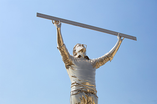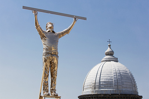 Nato ad Anversa nel 1958, domani il grande performer, drammaturgo, regista, coreografo, disegnatore, scultore torna a Napoli a quasi 10 anni dalla mostra che portò in piazza del Plebiscito i suoi “uomini” che a turno accendo fuoco, piangono e ridono, o che – come nel caso di Anversa, due anni fa – reggono in bilico sul palmo della mano la Croce. All’epoca, il progetto curato da Eduardo Cicelyn e Mario Codognato, si chiamava “Il ragazzo con la luna e le stelle sulla testa”, e metteva in scena una serie di personaggi-autoritratto in bronzo a grandezza naturale, dove ognuno interpretava un ruolo in relazione all’immaginario della città partenopea.
