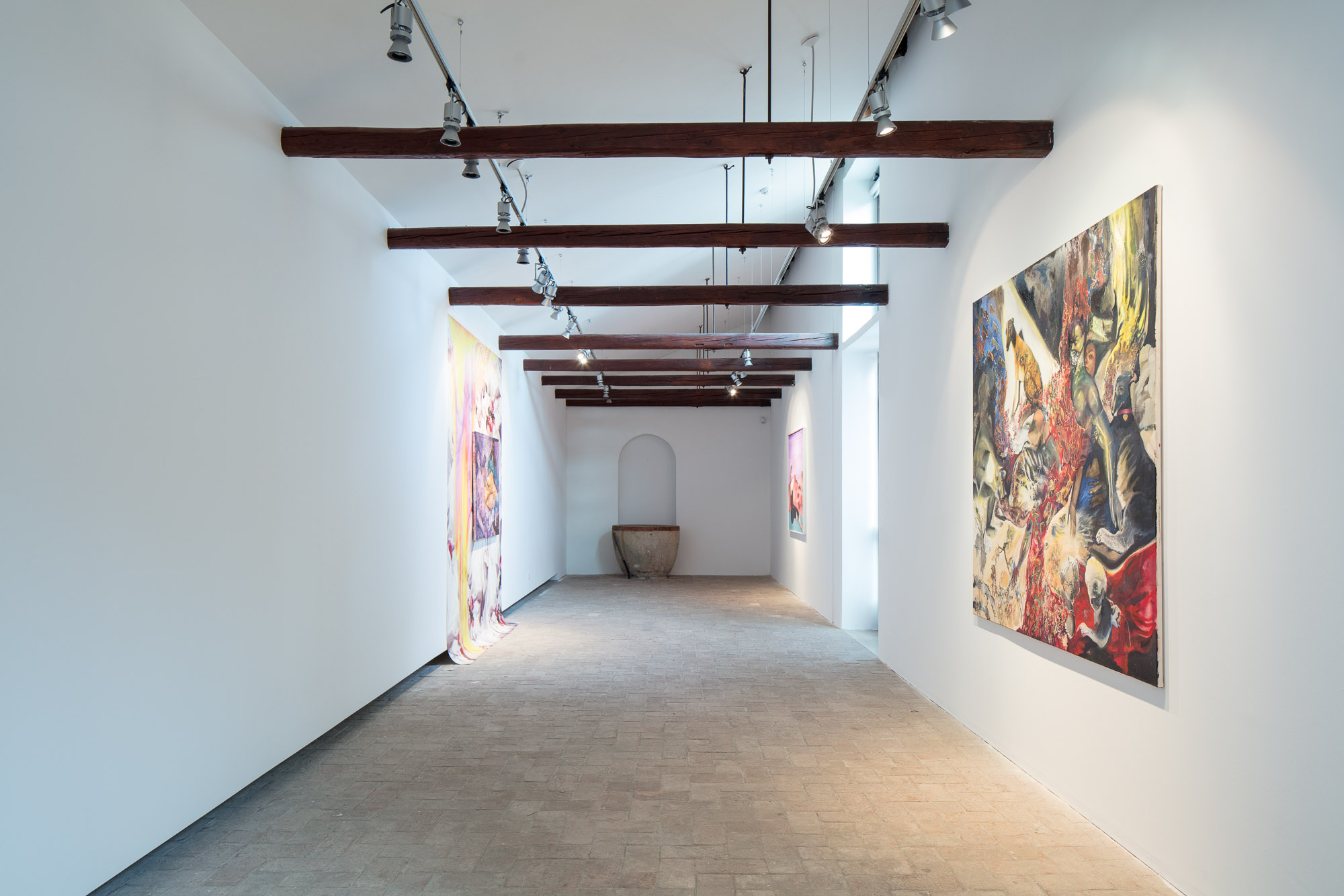 «Lo spettatore appena entra in mostra vede subito il dipinto di Bellucci posto in analogia visiva con un’opera di Giuseppe Gonella che destruttura il topos iconografico attraverso un dualismo formale e di significati che mettono in crisi la narrazione tradizionale. Il dispositivo mostra propone una pluralità di rese concettuali e formali, dove gli autori tessono un rapporto dialogico tra il passato e le istanze del presente. Si alternano anche una pluralità di declinazioni mediali come l’affresco proposto da Nicola Samorì, dove l’autore ha realizzato la pioggia d’oro per sottrazione scalpellando il suo stesso lavoro, o Matteo Fato la cui opera porta ragionare sullo statuto stesso della pittura che si espande nello spazio».