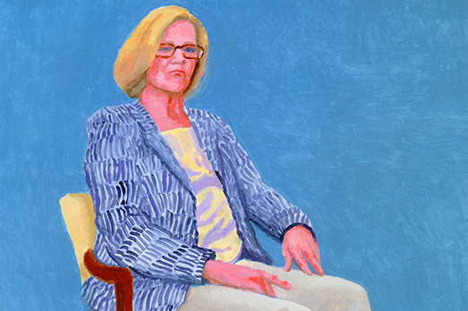 Immaginatevi seduti, perfettamente immobili, bloccati su una sedia non troppo comoda (modello vagamente Biedermeier), con un vecchio uomo intento a scrutarvi intensamente, per tre giorni consecutivi, per venti ore di posa. Forse vi sentireste un po’ a disagio, con le terga indolenzite e un formicolio di inquietudine. Come in un sequel di Saw-L’enigmista. Ma è questo il prezzo che avreste dovuto pagare al grande David Hockney se aveste accettato di posare per uno dei suoi 82 ritratti in mostra a Ca’ Pesaro. Eseguiti con colori acrilici tra il 2013 e il 2016, sono tutti identici nel formato (121,9×91,4 cm), hanno la stessa intensa luce del suo studio californiano e il medesimo sfondo colorato in blu e verde, tanto da essere considerati dall’artista come un unico corpus di lavori. Questi ritratti accolgono una tassonomia di tipi e caratteri diversi, un saggio visivo sul corpo umano che trascende le classificazioni di genere, identità e nazionalità. All’interno dell’apparentemente limitato formato della figura, assisa su uno sfondo bitonale, si frammenta e si esprime un’infinita gamma di temperamenti umani.