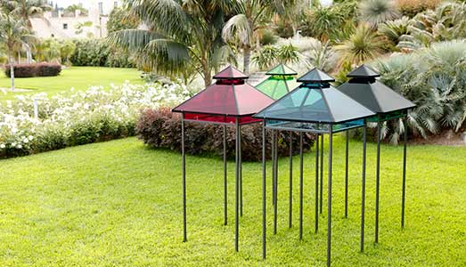In alto e in homepage: Federico Baronello,  Diagramma #4 (Gazebo), 2018. Acciaio verniciato, plexiglass. Quattro gazebo, ciascuno 240 x 100 x 100 cm. Fondazione Radicepura, Giarre (CT). L’opera si completa con un video HD in progress perché implementato dai selfie dei visitatori sotto il gazebo e proiettato all’interno dei locali della Fondazione.