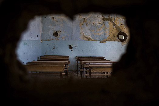 “GUERRE” è il titolo del progetto di Mudima Lab nato dalla volontà di dare visibilità ai fotoreporter di guerra che spesso non hanno istituzioni alle spalle e rischiano la vita nelle aree di conflitto contemporanee. Dopo il lavoro di Fabio Bucciarelli (Premio Robert Capa 2012, World Press Photo 2013) tratto dal progetto “The Dream”, e di Manu Brabo (Premio Pulitzer 2013 per il fotogiornalismo) con “Libia. Illusione di libertà”, si presenta oggi nei locali di via Tadino al civico 20, il lavoro del fotoreporter freelance Diego Ibarra Sánchez. Da oltre un decennio impegnato nella ricerca dal titolo “Hijacked Education”. Tra Pakistan, Afghanistan, Iraq, Siria, Nigeria, Libano, la sua è una denuncia lucida, quanto drammaticamente spietata, sulle condizioni di bambini e ragazzi in età scolare durante i periodi di guerra. Il titolo, “Hijacked Education”, d’altronde non lascia dubbi sul messaggio che il fotografo intende comunicare: “l’istruzione, la cultura, la scuola sottratte” a bambini, così inevitabilmente condannati a “rimanere indietro”, derubati per sempre del loro futuro. «La violenza, l’estremismo, l’intolleranza e la paura – ha dichiarato il fotoreporter – stanno cancellando il futuro di un’intera generazione di migliaia di bambini. Ci sono scuole distrutte e abbandonate, come altari senza forma della conoscenza perduta. Ci sono insegnanti e studenti in esilio, bambini-soldato, un’istruzione rapita e stuprata. Ci sono libri bruciati, fotografie sul pavimento, identità perse e rubate. Ci sono classi vuote, banchi ammucchiati, accatastati, coperti con il vuoto dell’ignoranza».