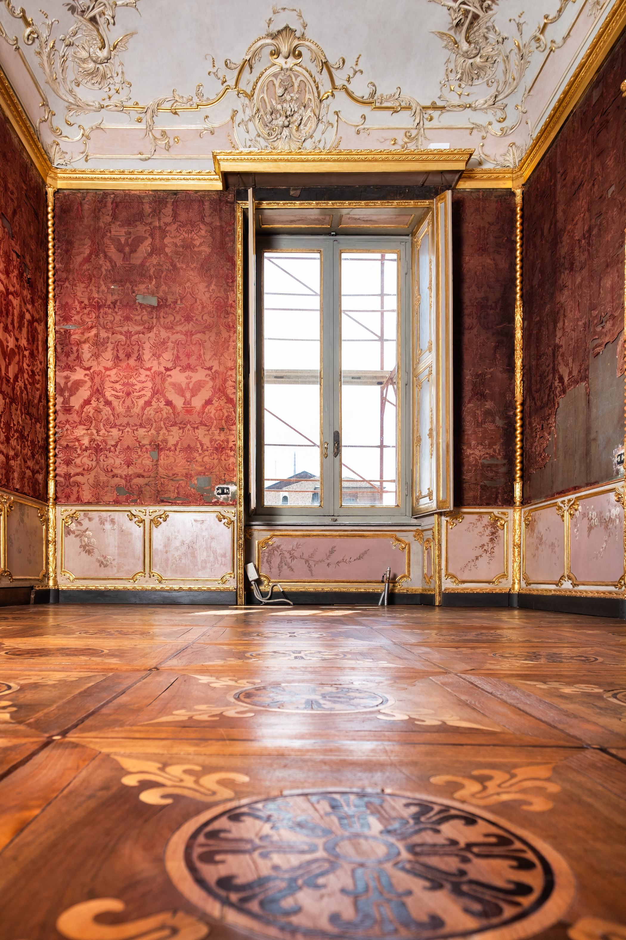 Nel Salottino adiacente alla Camera dell’Alcova la rimozione della tappezzeria recente ha rivelato la presenza di un tessuto ottocentesco in seta operata di colore cremisi. Oggi interessata da ampie lacerazioni e da un avanzato stato di degrado, l’antica tappezzeria sarà presto oggetto di un complesso intervento di recupero conservativo.