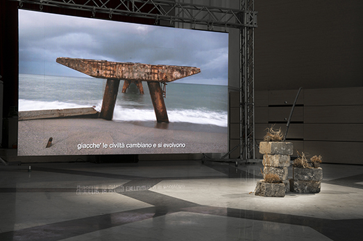 L’installazione video, sicuramente una delle componenti più interessanti dell’estate palermitana di Manifesta12, permette di avvicinarsi alle architetture incompiute grazie ad inquadrature fisse, accelerate o rallentate, per penetrarle attraverso riprese aeree e in soggettiva. A queste immagini si alterna un dialogo tra Marc Augé e Robert Storr. I due studiosi analizzano la contraddizione che portano in sé queste strutture, rovine di un futuro mai realizzatosi. Davanti allo schermo è presente una scultura composta con materiali da costruzione estratti da un sito incompiuto, su cui spicca una Katana realizzata dalla lavorazione di un tondino in ferro zigrinato. Sfortunatamente per chi visiterà Palermo nelle prossime settimane, l’installazione, aperta fino al 20 giugno, non è più visitabile.
