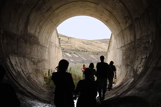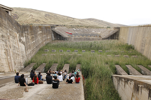Dopo un incontro iniziale in prossimità dell’impianto idrico abbandonato, i visitatori hanno percorso senza illuminazione il tunnel che attraversa tutta la struttura, dovendo procedere a tentoni nella parte centrale data la totale assenza di luce. Al termine di questo passaggio, tra il platonico e il post-atomico, il gruppo, composto da persone di ogni tipo, da famiglie con bambini, fino ad artisti del palermitano e giovanissimi skater, si è ritrovato di nuovo alla luce del sole, in un ambiente nel quale un canneto spontaneo si compenetra con il cemento della diga. Questo si è rivelato essere il punto di osservazione della performance dell’artista siciliana Claudia di Gangi che, indossando un lunghissimo drappo rosso, ha segnato visivamente gli argini della diga. Successivamente, una volta raggiunto il letto della diga, tramite delle corde appositamente installate, i visitatori hanno potuto arrampicarsi e scendere dagli argini a loro piacimento. La distopica scampagnata domenicale è terminata con un pranzo attorno al fuoco a base di pasta al forno e carne arrostita.