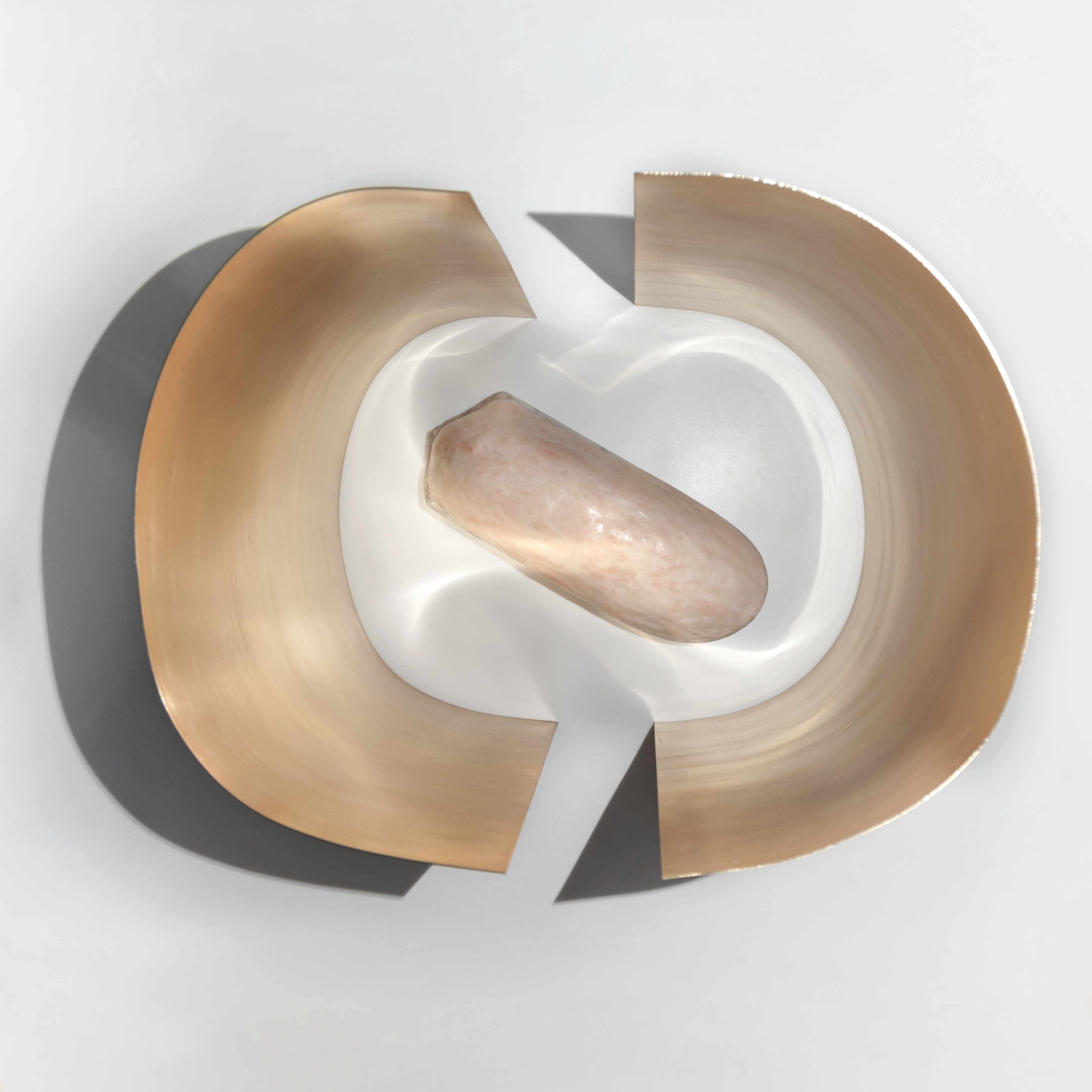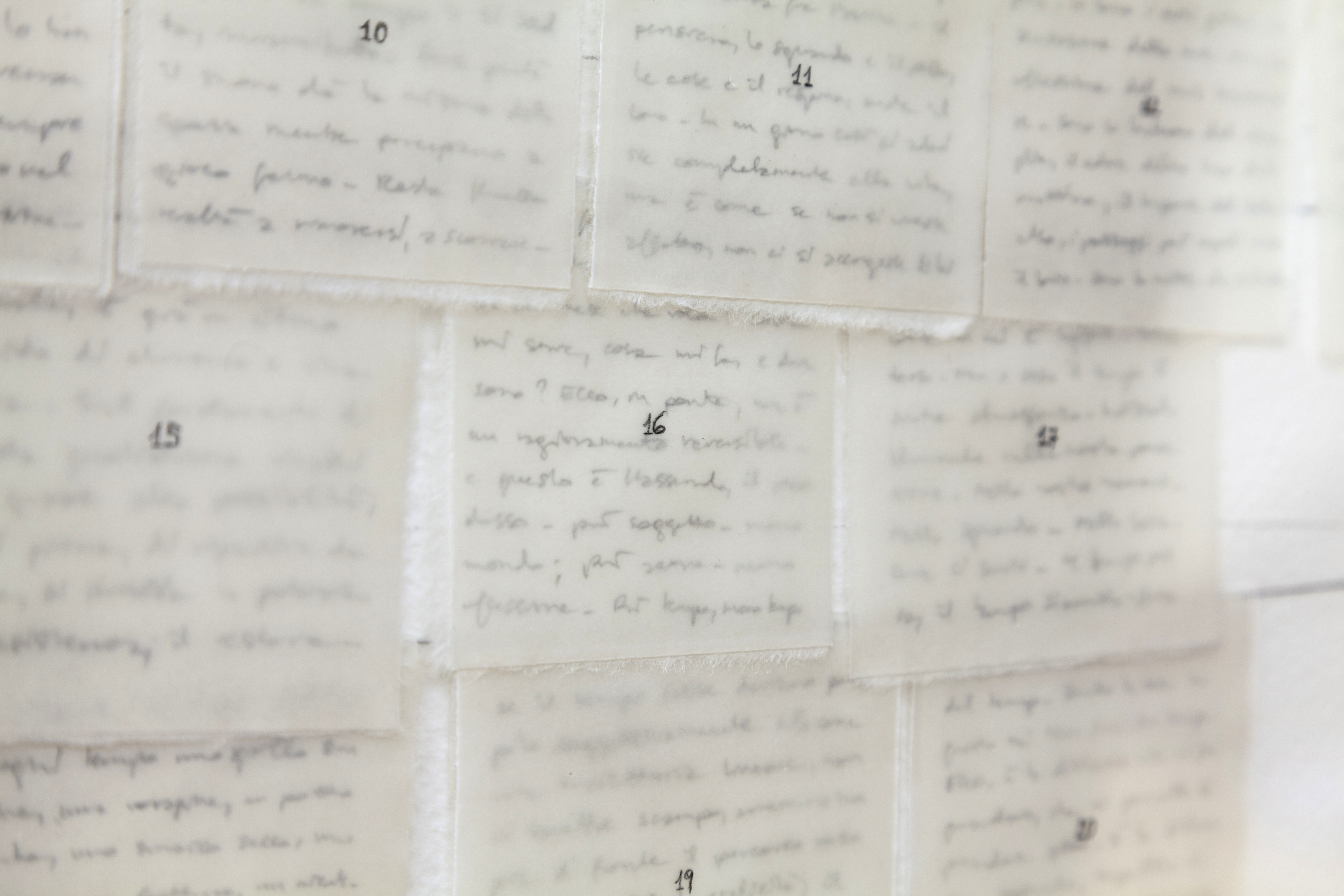 Quali forme del desiderio resistenti al trascorre del tempo sono possibili nella nostra epoca del “presentismo”, dell’esserci “qui e ora” esteso all’infinito nella rete? L’autrice non risponde, ma nel suo lavoro veicola sempre una ricerca di trascendenza, verso l’invisibile, genera nuove possibilità di riflessione che si fa materia del visibile attraverso la cera, la carta di riso, di seta o cerata, il gesso e anche la pietra e in Omphalos, una scultura freudiana, razionalmente erotica, anche con l’ottone.