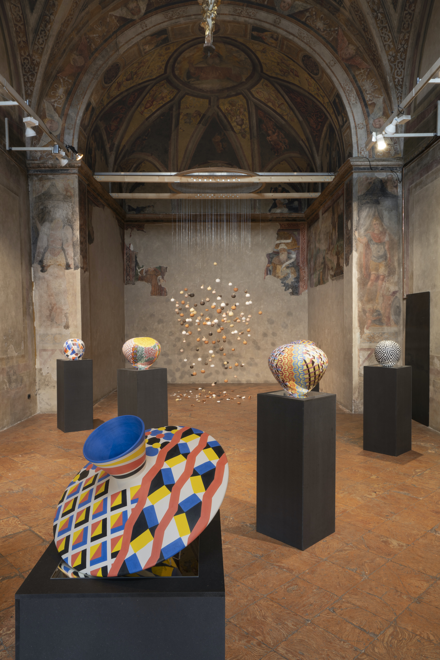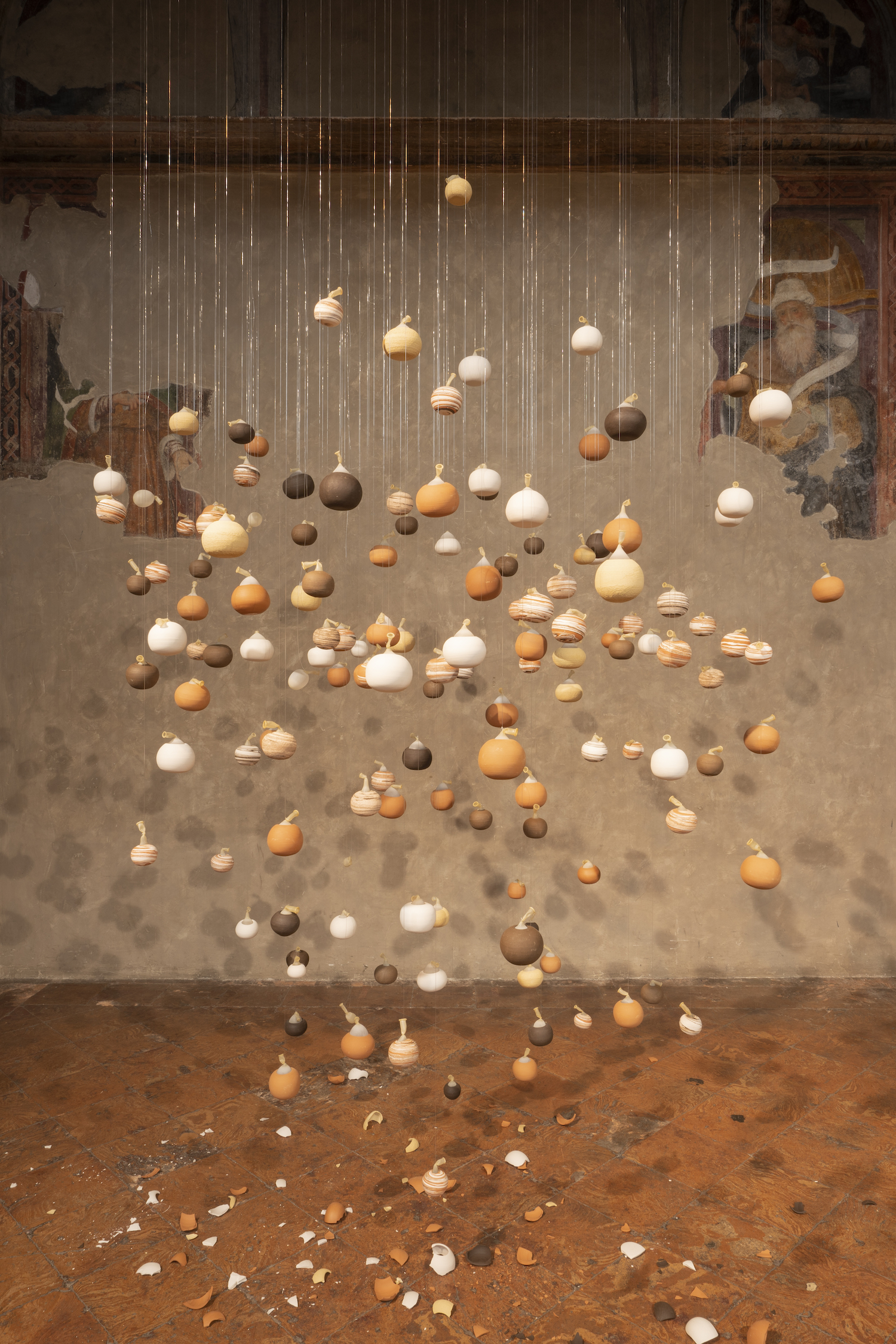 «Nella mostra viene presentata per la prima volta Breath, installazione sviluppata partendo da riflessioni su temi di attualità come la crisi sanitaria e il movimento Black Lives Matter, in cui l’artista ha elaborato una vanitas contemporanea. Una moltitudine di vasi sferici, appesi dall’alto tramite dei palloncini gonfi d’aria, divengono metafore della vita umana, insieme fragile e sacra. Le ceramiche circolari rappresentano il corpo che contiene la vita, rappresentata dall’aria contenuta nei palloncini che, esaurendosi gradualmente, fa cadere al suolo i vasi come corpi senza respiro. La sacralità dell’opera è accentuata dallo spazio espositivo scelto per la mostra, un antico oratorio parte del complesso monumentale della Basilica di Sant’Ambrogio. Inoltre, saranno presenti in mostra delle opere dalla forma sferica, vasi di ceramica dipinti a mano dall’artista in cui diversi motivi geometrici policromi si susseguono senza continuità, spezzando la rotondità della sfera e creando distorsioni nella percezione dell’opera».