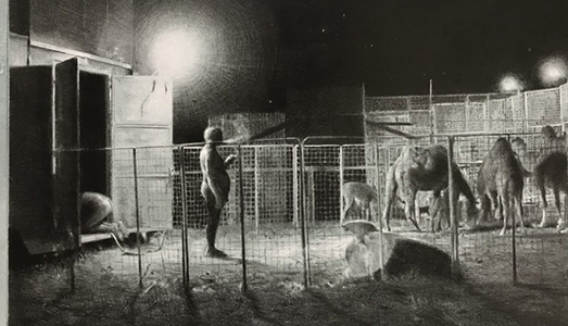 In alto: After the Circus, carboncino e gessetto bianco su carta colorata, cm 25×38, anno 2017