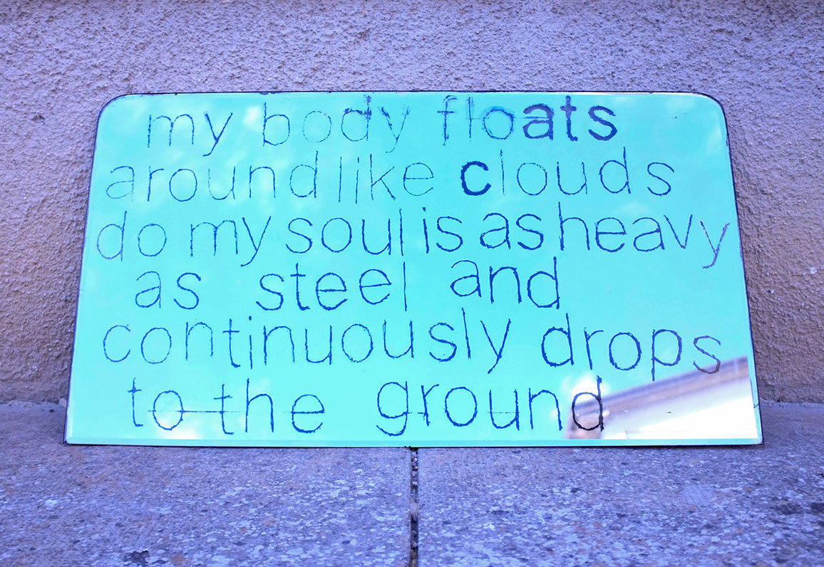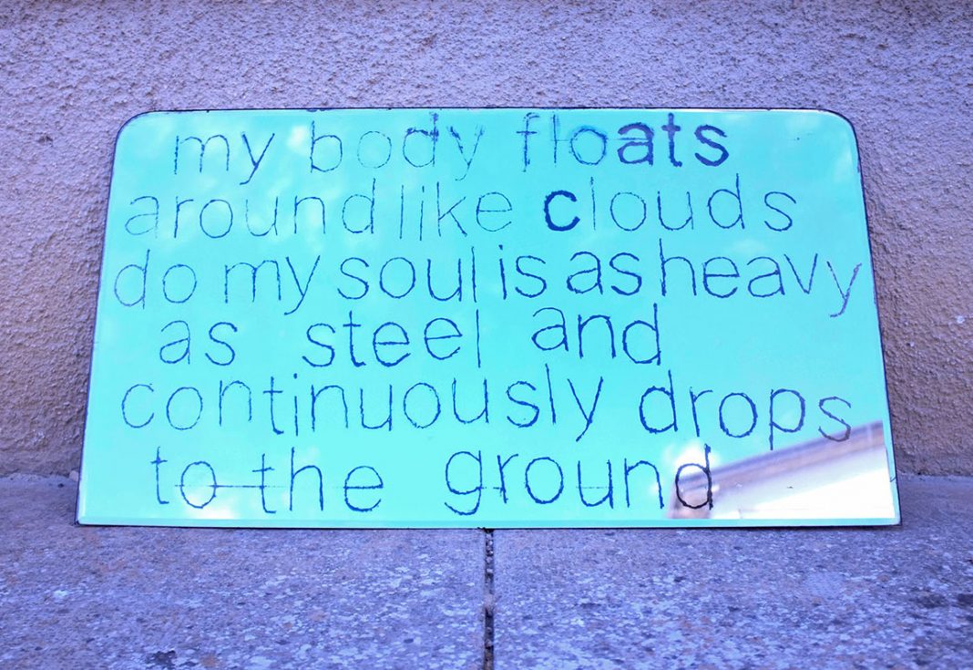 FGA: «Clouds and steel, come tanti miei lavori, tratta della continua tensione tra opposti, del continuo ribaltamento possibile e in atto tra elementi netti, semplici, reali. L’occhio dello spettatore salta da una scritta in superficie alla profondità di ciò che è riflesso in uno specchio. La frase che è stata incisa sul retro dello specchio associa la pesantezza al pensiero e la leggerezza al corpo, il contrario di quello che è il sentire comune: non è una frase sbagliata, apre una nuova prospettiva. Il possessivo, “my body […] my soul”, immediatamente, perché su uno specchio, diventa proprio dello spettatore».