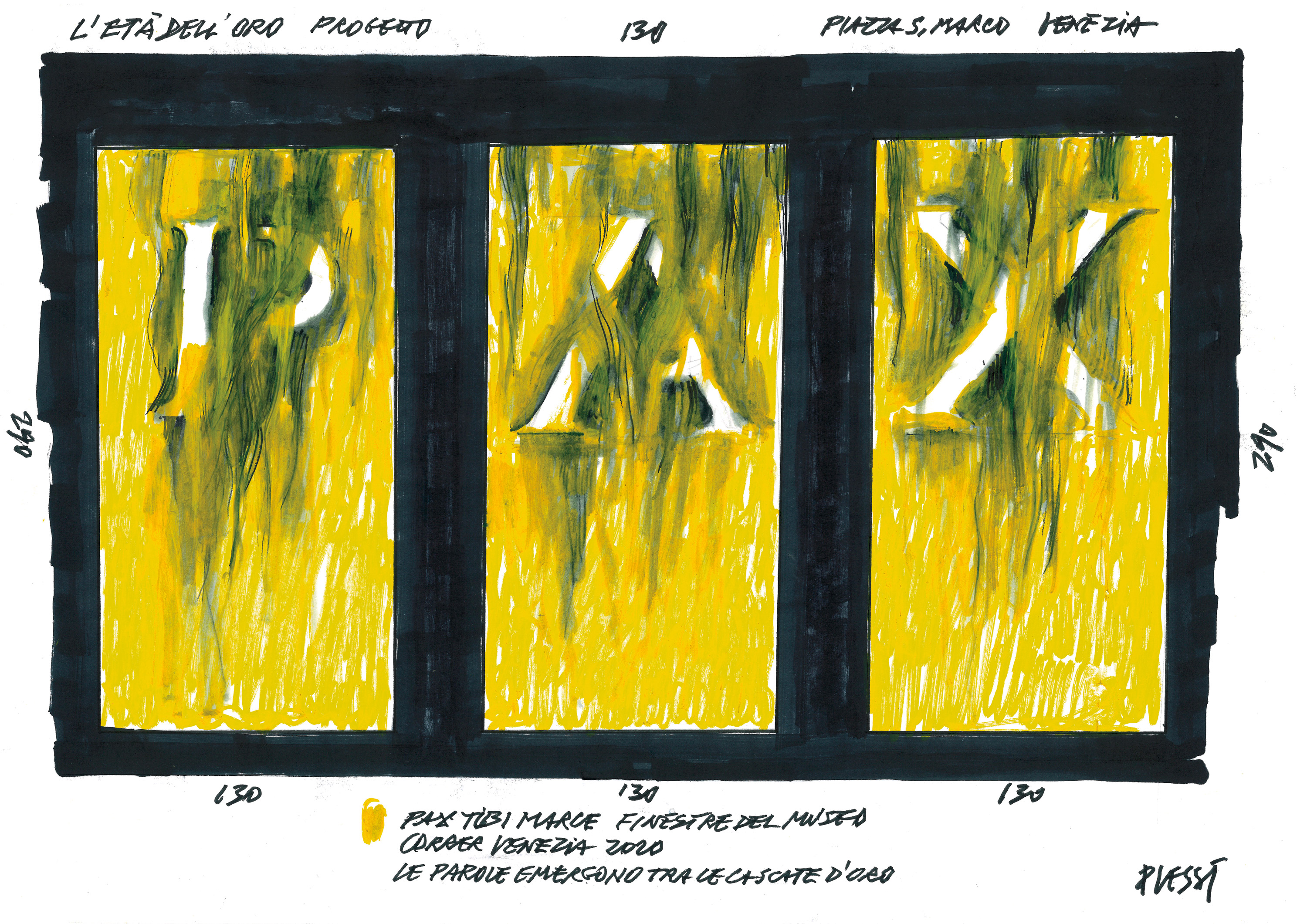 «Nelle cascate d’oro è racchiusa la scritta Pax Tibi, l’incipit della locuzione stampata sul Vangelo che il leone veneziano tiene tra le zampe. Pax Tibi, Marce, evangelista meus, Pace a te, Venezia, senza tempo come il nobile e puro materiale. L’oro a Venezia è simbolo, è anche sapienza artigiana di indoratore, che Fabrizio Plessi traduce in un flusso digitale contemporaneo, a saldare come sempre l’apparente opposizione fra elementi primordiali e tecnologie, natura e artificio, tradizione e futuro.