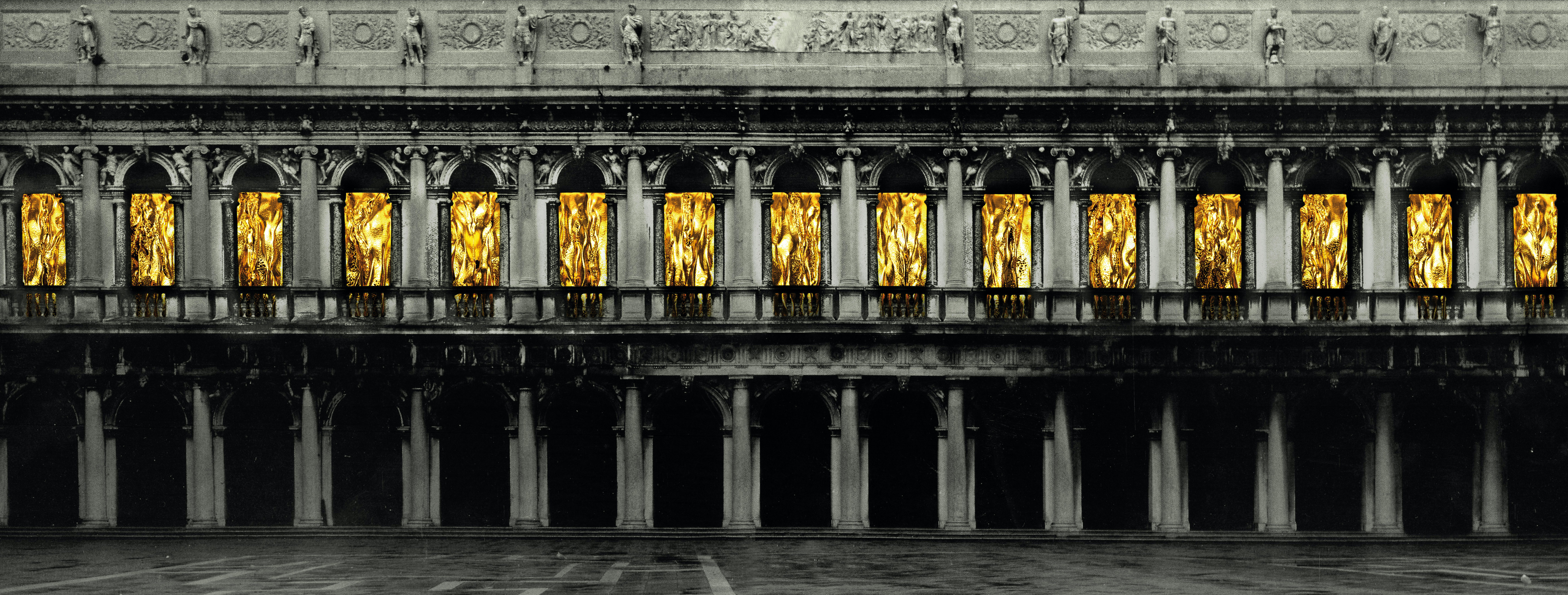 Le finestre del Museo Correr nel lato di Piazza San Marco opposto alla Basilica, sono la sede dell’apparizione scenografica, luminosa e sonora, di cascate d’oro senza origine né fine, di un potente e dirompente loop magmatico che si mostra nel cuore di quella che fu la Serenissima. L’Età dell’Oro è un tempo sospeso e circolare, che senza nostalgia ma con concreto senso del presente avvolge Venezia, città oggi ferita ma di eterna incorruttibile bellezza che a tutto sopravvive.
