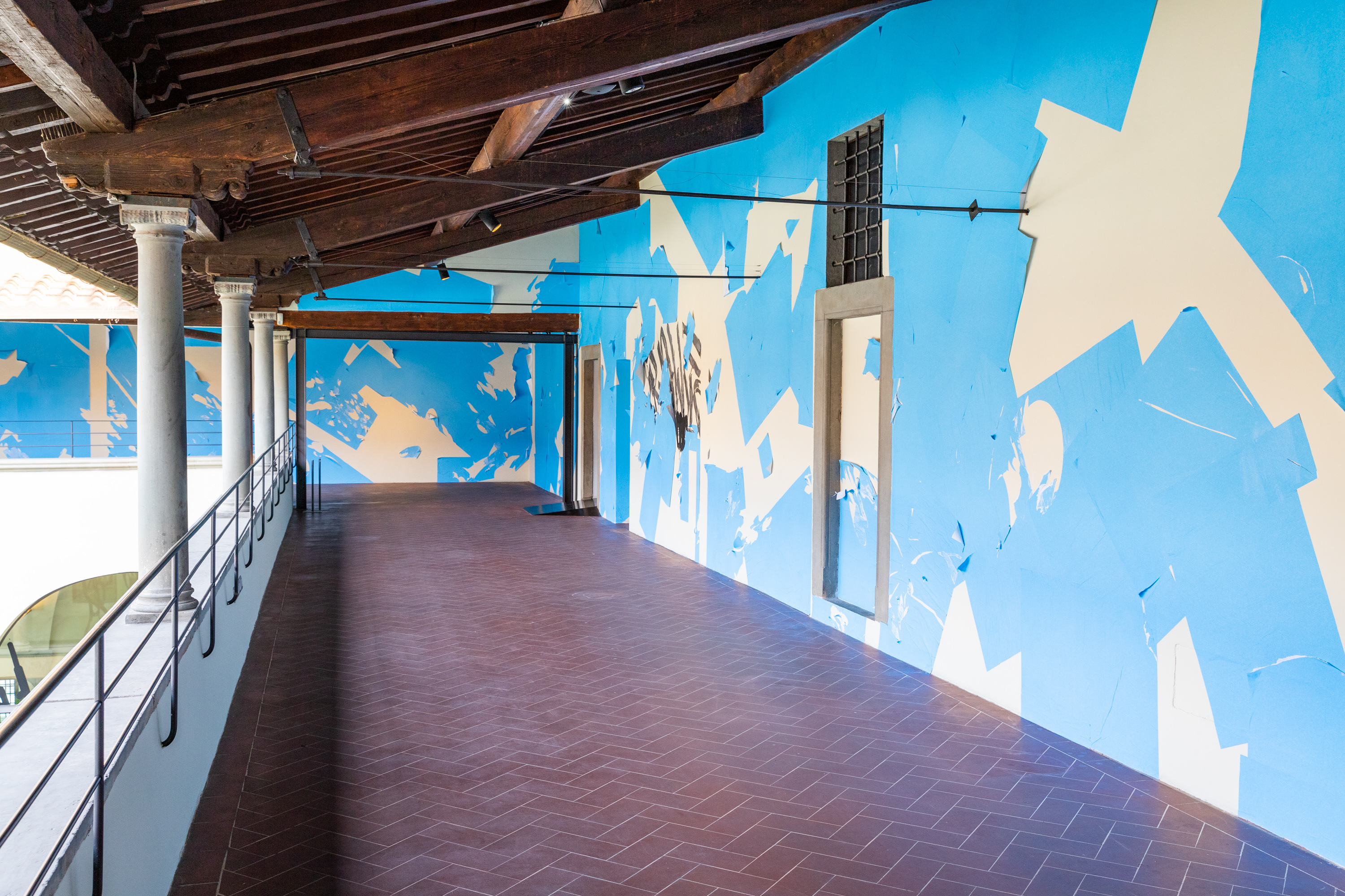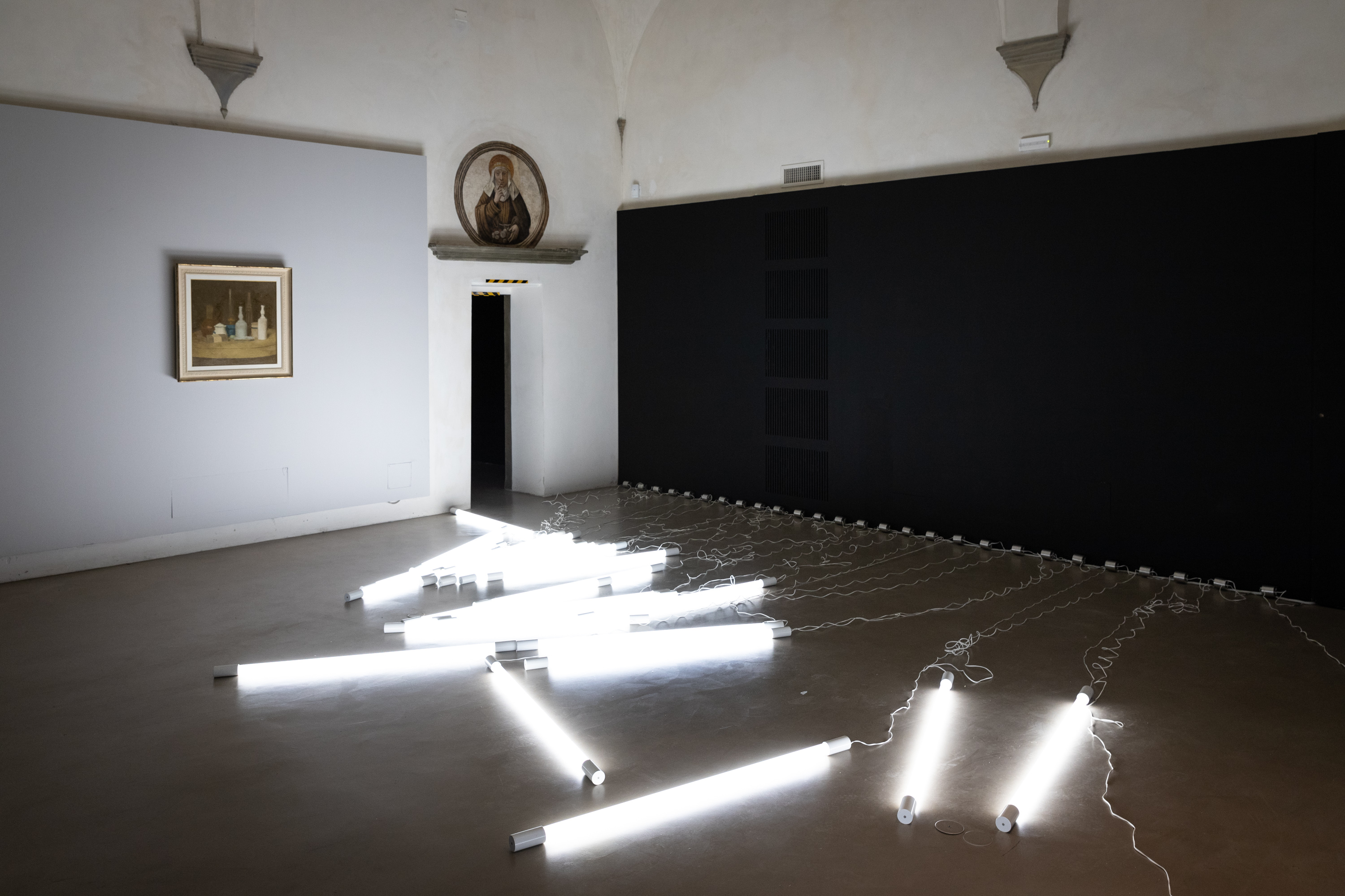 Vedovamazzei: «La mostra a Firenze nasce come una riflessione sul Black and White, ma con una variante. La variante è dovuta al dialogo speciale che si viene a creare tra le opere esposte assieme per la prima volta: il merlo nero infilato con il becco nel muro, un bellissimo ritratto di una scrittrice inglese in bianco e nero e, per finire, l’installazione con la luce, la quale è bianca. La lampadina che oscilla nel vuoto crea una nuova percezione dello spazio e degli altri nostri interventi attraverso il confronto tra il colore (nero) e la luce».