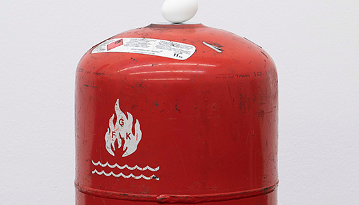 In alto: Florian Neufeldt, Sealed Vessels, (detail) 2018, gas bottle red, chicken egg, 48x29x29 cm