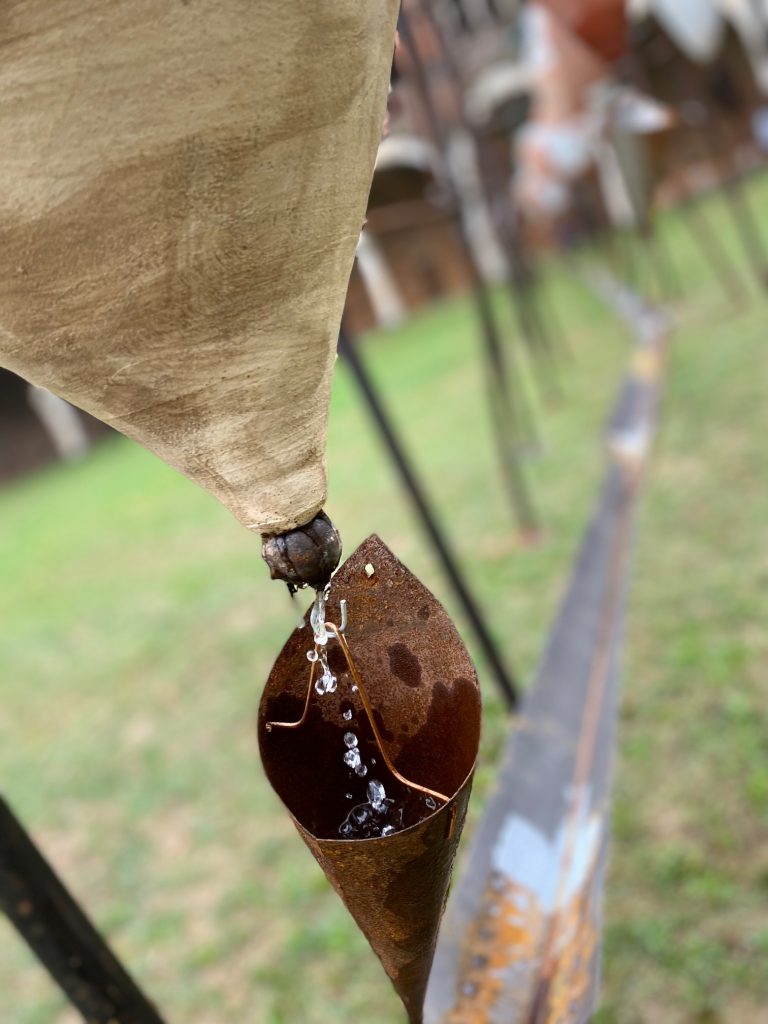 «L’allestimento ha come motivo ispiratore l’acqua e così i 30 otri di terracotta su strutture di ferro in sospensione nel cortile del Castello, sono dei veri e propri vasi, grembi che costituiscono la forma plastica scelta dall’Artista quale motivo ricorrente delle installazioni. L’otre diventa un dispositivo simbolico che allude all’uomo e alla sua unicità e, in particolare, al monaco nel suo silenzioso e volontario isolamento, pur all’interno di una dimensione collettiva», hanno spiegato gli organizzatori.