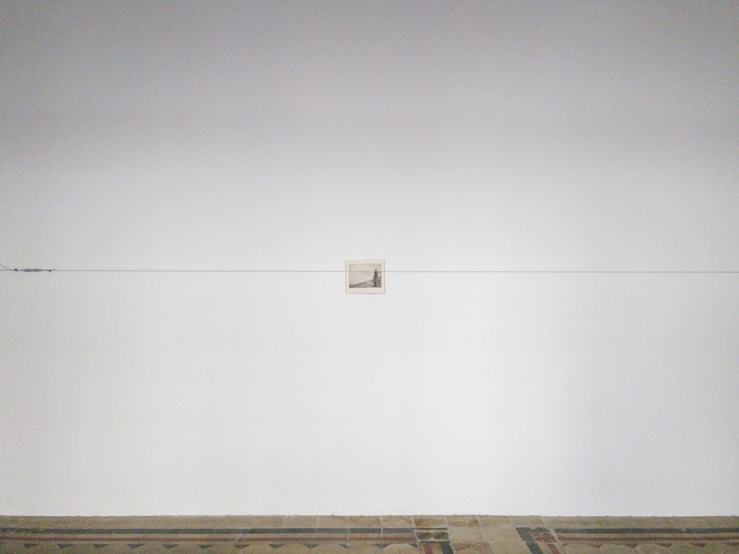 La mostra attuale è fatta di tre cose, nel senso che ogni opera nasce da una cosa/oggetto esistente al di là dell’opera. Una foto, una trave, una bandiera. Oggetti che hanno subito una trasformazione più o meno evidente che comunque ne cambia la loro fruizione destinandoli ad altro utilizzo rispetto a quello per i quali sono stati concepiti, inoltre le tre opere condividono formalmente il fatto di essere delle linee, punto di partenza dopo il Punto di ogni rappresentazione. Probabilmente questa mostra rispetto alle due precedenti da Raffaella ha un dialogo più serrato tra le tre opere esposte».