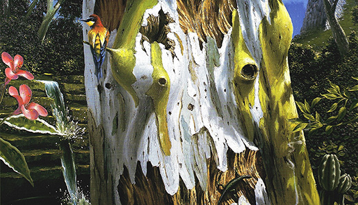 Bizzarro, stravagante, fantasioso sono aggettivi troppo semplici, certamente riduttivi nel caso di Fulvio Di Piazza. Il tentativo di inquadrare l’artista in un qualche genere o ambito – ultimo dei quali il Pop-surrealism – non rende giustizia alla singolarità dell’autore, che con lucida follia persegue un’identità e un’originalità maturata nella pratica stessa della pittura, nel suo farsi continuo, inarrestabile, inesauribile. In punta di pennello hanno origine le inconfondibili creature fitomorfe dell’artista, così come le perturbanti catastrofi ambientali e i numerosi auto-ritratti (una costante sin dagli anni Novanta) che vengono dissimulati nell’ambiente. Nella pittura di Fulvio Di Piazza traspare un’empatia, un impulso che tende all’immedesimazione con il mondo naturale e le sue forme organiche. Ciò nondimeno, le sue creature grottesche sembrano originarsi da un caso fortuito anziché da un normale processo evolutivo; un ruolo demiurgico, in parte profetico e in parte funesto, che alterna il rigoglio vegetale ai vapori e ai lapilli di un’autodistruzione. Rispetto ai sette giorni della creazione divina, in questi dipinti prende il sopravvento una Genesi minore, non ortodossa, che ancora ignora l’esistenza dell’homo sapiens, benché ne rispecchi sia i pregi che i difetti. Ebbene, l’immaginario di Fulvio Di Piazza ci offre dei surrogati antropici, intrisi di invenzioni e di conflitti che ogni fruitore è invitato a interpretare da molto vicino (rischiando invero di restare invischiato nella ricca densità della pittura).